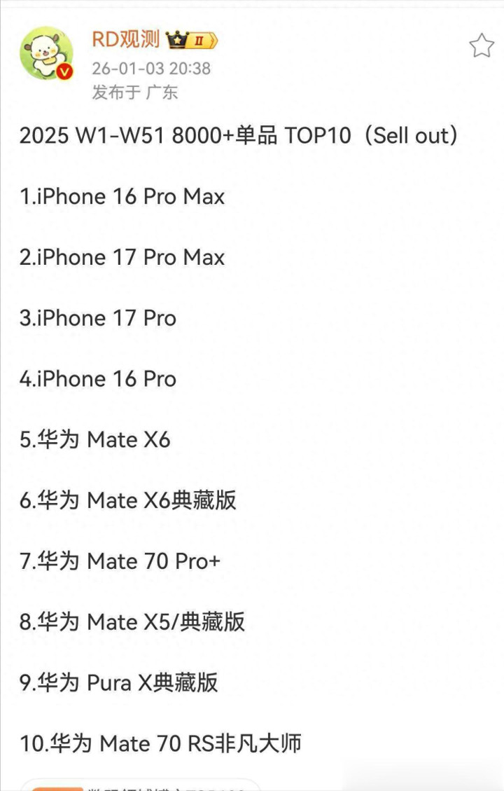 2026年1月3日消息,根据第三方数据机构RD观测的数据中国股票配资网网站,截止W51,国内智能手机市场8000+ 超高端档位销量(sell out)TOP10机型出炉,苹果和华为霸榜。